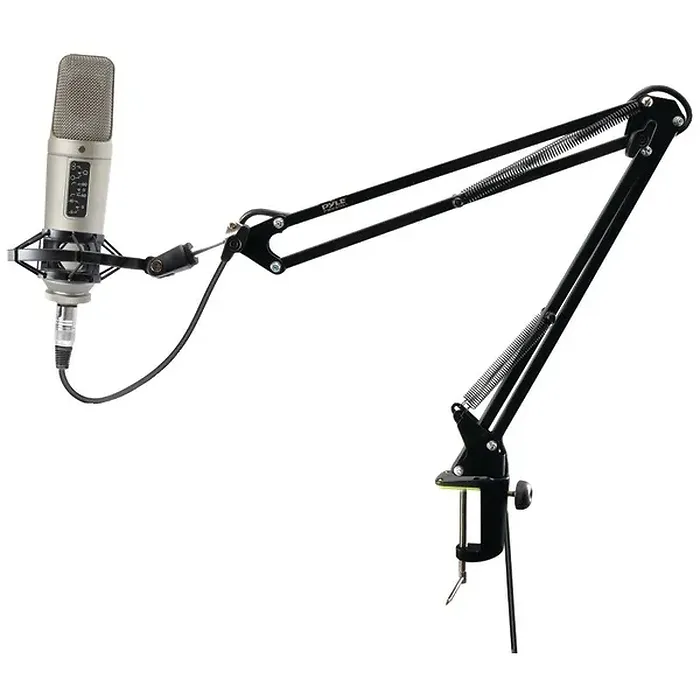 The Pyle Suspension Scissor Microphone Stand provides quick and convenient mic placement. Adjustable boom stand and extending arms keep your mic in place via suspension springs for optimal audio performance. Whether used for radio broadcasting, recording or streaming -- you will enjoy quick setup and reliable microphone placement. Additional mount features include integrated XLR connection cable, microphone shock mount and USA standard adapter threading, all designed for hands-free audio & vocal recording. The clamp-style locking support base provides versatile mounting ability for microphone attachment over any table, counter or computer desktop. Enjoy convenient audio control and position your mic exactly where needed with the Pyle Stage & Studio Desk Suspension Boom Microphone Mount (microphone not included).