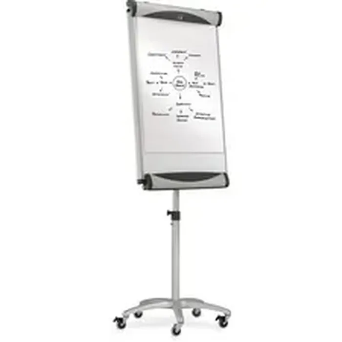 Mobile easel features a magnetic porcelain surface and brushed silver frame. DuraMax Porcelain will not scratch or dent, and the Total Erase surface will not stain or ghost. The steel-backed porcelain creates a magnetic surface that doubles as a bulletin board. Easel features an accessory tray and five-star base with two locking casters. Flip chart pad holder accommodates all pads and adjusts in height from 67" to 77". Board surface measures 27" x 41".