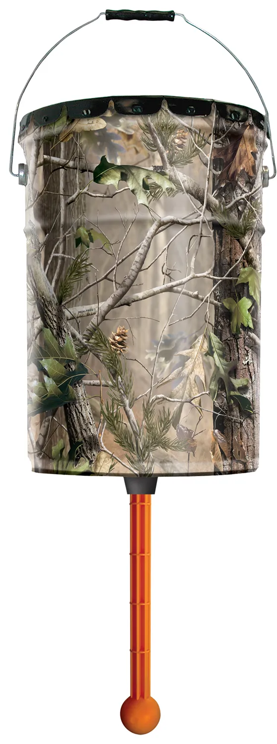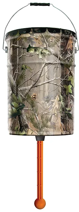- Durable 6.5 gal/50lbs hanging pail design- Realtree Xtra camo barrel- Plastic photocell power control unit- Dawn and dusk available feed times- Galvanized steel spinner plate- 6V battery operation (not included)