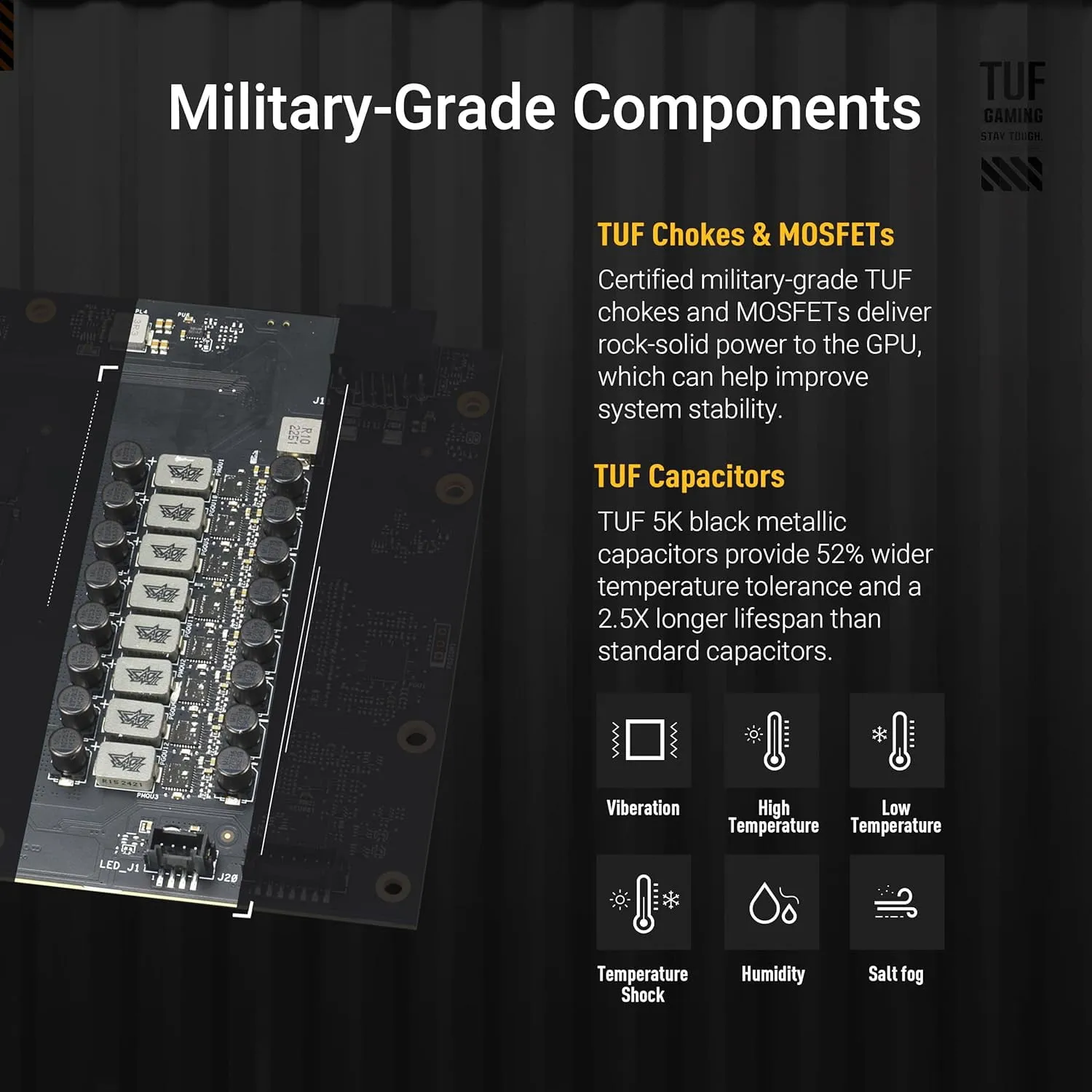 Equipped with advanced features such as HDMI/DP 2.1 for immersive visuals, this card is ideal for high-resolution gaming and professional rendering tasks. The TUF design incorporates military-grade components and a protective PCB coating, ensuring durability and longevity, while the axial tech fans provide superior cooling to keep temperatures low during intense use.