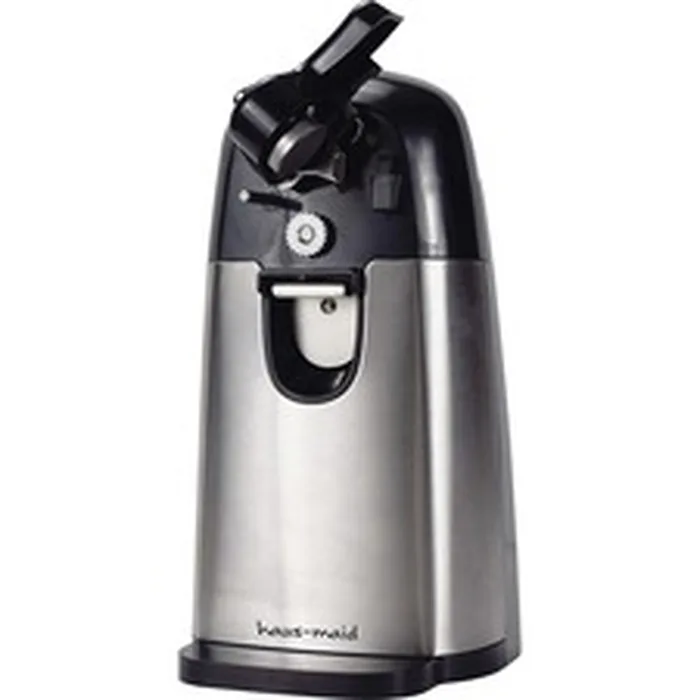 Versatile can opener lets you open any size can safely and easily with precise cutting for consistent performance. Magnet grabs the can lid once the blade finishes its full rotation. Haus-Maid Electric Can Opener also includes a bottle opener in front, knife blade sharpener in back and 2-1/4' cord. Stainless steel bottom and black plastic top provides a durable easy-to-clean construction and professional look. Compact size is great for breakrooms and tight spaces.