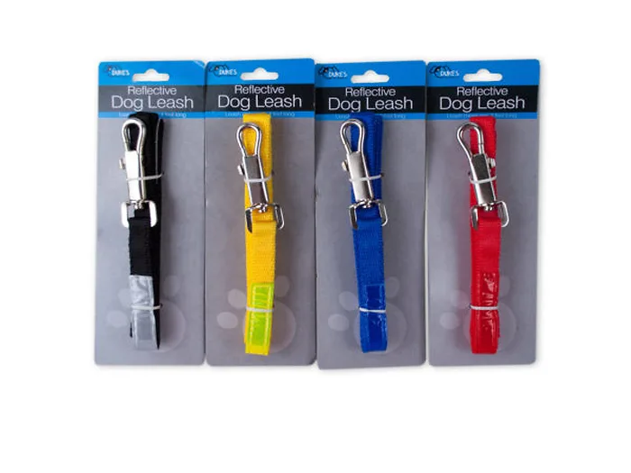 A great pet accessory for those who walk pets in early morning or late hours, this Reflective Dog Leash helps make sure motorists see you and your pet. Each leash has a matching reflective surface. Leashes are approximately 4' long with a 2.25" snap clip that attaches to most collars. Reflective area is 11.5" long. Comes in assorted colors. Comes packaged to a tie card.