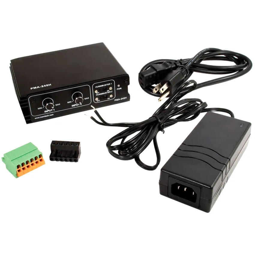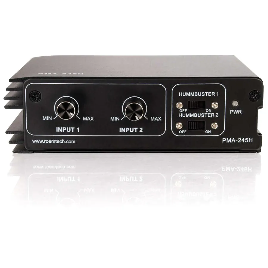 Plenum-Rated 45 Watt Stereo Mixer/Amplifier. Provides crisp audio in a compact design with HummBuster technology