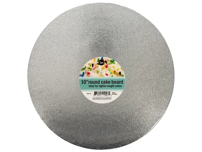 Ideal for lighter weight cakes, this 10" Round Cake Board makes moving cakes easy and features an attractive textured foil covering for enhanced display. Comes shrink wrapped with a hang tag.