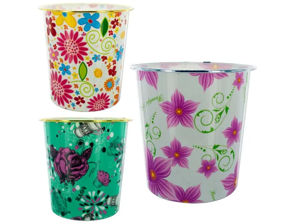 Perfect for any area that needs a little place to collect trash, this pretty Round Floral Design Wastebasket features a durable plastic container with a pretty floral or polka dot pattern and a silver metal rim. Measures approximately 7.5" tall x 7.25" in diameter. Comes in assorted styles. Comes loose with a UPC label.