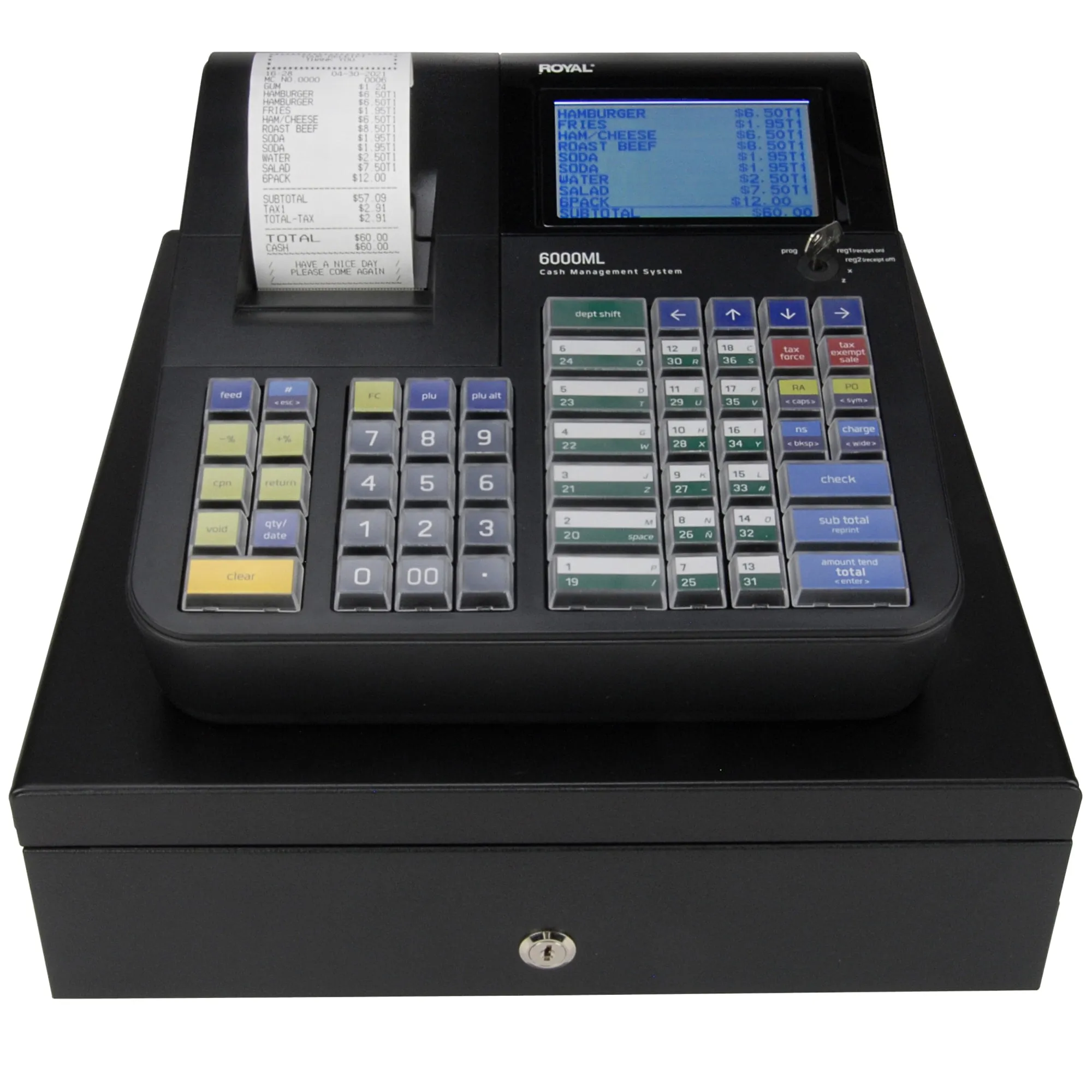 The Royal 6000ML Cash Register is a compact cash register which is designed to help your business function smoothly by providing efficient register operations and accurate management reports. Start-up is quick and easy, yet there are many options that can be added and revised so that you can customize your operations for optimum productivity. Here are just a few of the register's many valuable features. Features: 36 Departments for sales analysis by category. 6,000 Price Look-ups (PLUs) for quick, accurate entry of frequently sold items. 10 Clerk Ids: System can program each clerk with 24 character name or description. Alphanumeric Thermal Printer, 10-Line Alphanumeric LCD Front Display, 1-Line LED Rear Display, SD Card Reader/Writer Slot for Data Transfer, 4-Slot Bill and 6-Slot Coin Trays. Locking Cash Drawer, 4 Tax Rates, Cash, Check and Charge Sales Recording, Electronic Journal and Management Reports, Battery Backup Memory Protection, Accounting Software Link.