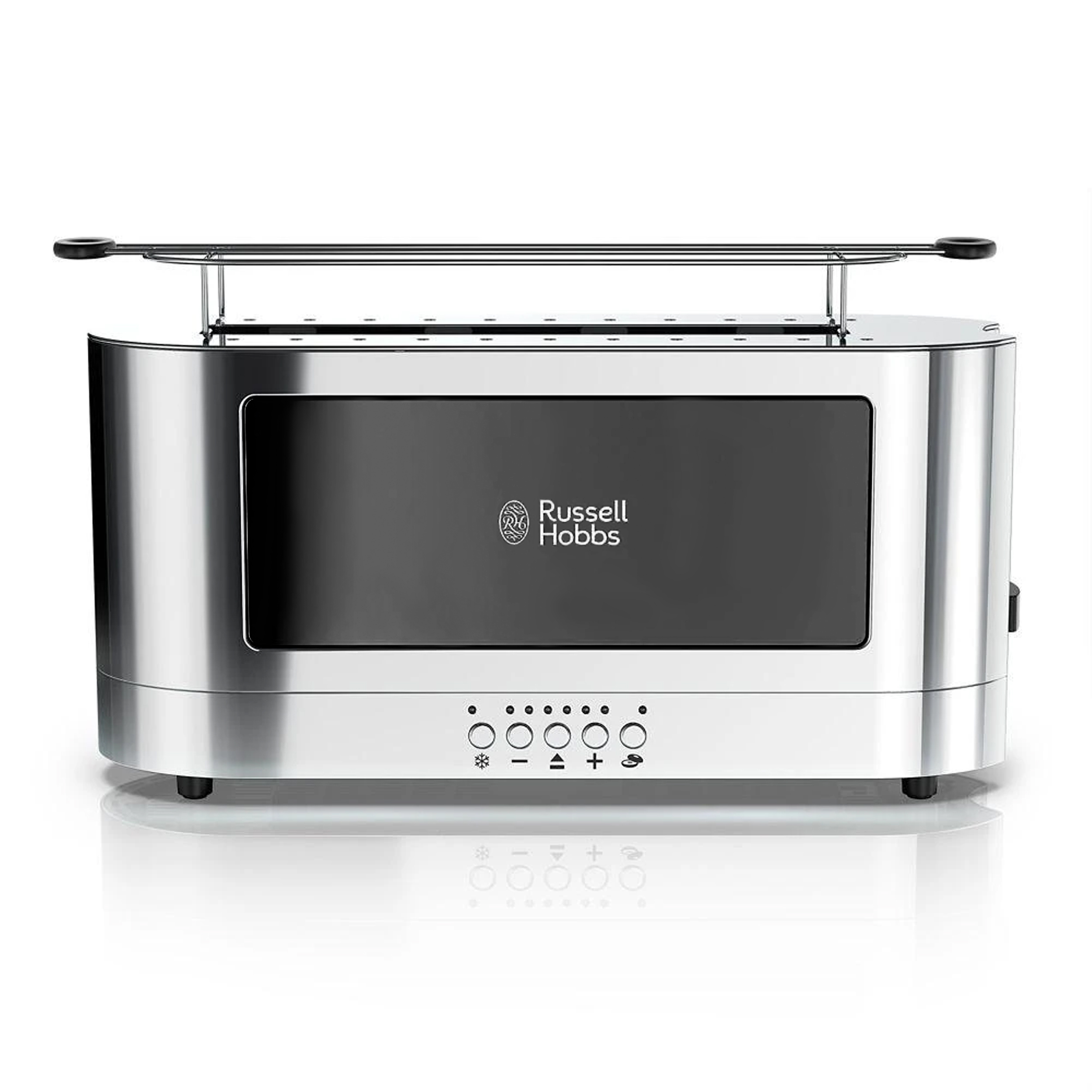 Bring modern styling to the home kitchen with the Russell Hobbs Stainless Steel 2 Slice Long Toaster with Black Glass Accent. The adjustable thermostat allows for better control over the browning of the toast. Choose between 6 options from dark to light for the perfect toast. Features a bagel setting to toast the cut side and warm up the bagel exterior. Thaw and freshen out freezer stored items with the freeze feature. Includes a warming rack to warm up pastry rolls and while the bread slices toast. The easy to use toaster is easy to clean with the removable crumb tray and with the cord storage it can be stored into small spaces.