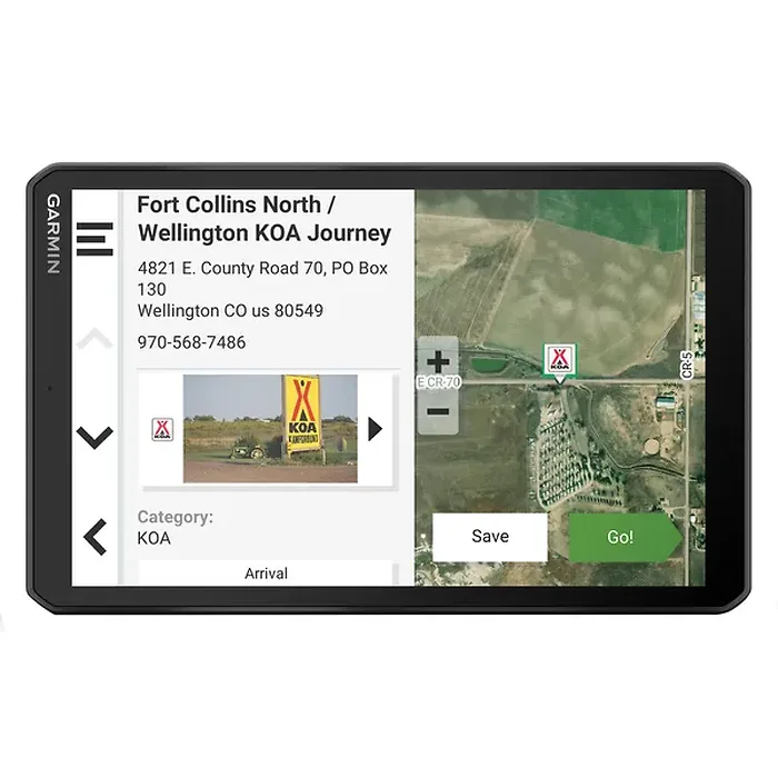 • Designed to add RV-friendly GPS navigation to RVs and motorhomes;• Bluetooth(R) connectivity for hands-free calling; pairs with free Garmin Drive(TM) app on compatible smartphone to see text messages and other notifications displayed on navigator's screen;• Large, 8-in. color TFT capacitive touch screen shows route and detailed maps; 1280 x 800 resolution;• Preloaded with North American maps including U.S., Mexico, Canada, Puerto Rico, U.S. Virgin Islands, Cayman Islands, and Bahamas; preloaded directory of RV parks and services;• Tripadvisor(R) traveler ratings and content from Ultimate Public Campgrounds, KOA(R), U.S. national parks directory, PlanRV(TM) and millions of latest and popular points of interest from Foursquare(R);• BirdsEye Satellite Imagery shows vivid aerial views to help with smooth arrival at RV park or campground;• Custom RV routing for size and weight of RV or trailer; not available in all areas and may not account for all of RV or trailer's characteristics; user must defer to all posted road signs and road conditions;• Forward collision and lane departure warnings encourages safer driving; alerts for school zones, sharp curves, and speed changes help increase driver awareness; certain conditions may impair the warning function ;• Roadtrip Route suggests more adventurous trips or scenic roads; easy trip planning when paired with Garmin Drive(TM) app to easily import and share routes and share GPX files;• Garmin(R) voice assist responds to speech and then navigates to destination;• Ability to stay informed with live traffic, weather, fuel prices, and smart notifications and ability to access loyalty points at participating U.S. travel plazas including Pilot Travel Centers LLC(R) and Love's Travel Stops(R) when navigator is paired with Garmin Drive(TM) app;• Built-in Wi-Fi(R) keeps maps and software up to date without using computer; on-screen cues show when new updates are available;• Compatible with BC(TM) 50 backup camera and Garmin PowerSwitch(TM) digital switch box to easily control vehicle's 12-volt electronics such as lights, fans, and more (each sold separately);• Includes vehicle suction cup with powered magnetic mount, screw down mount, 1-in. ball adapter with AMPS plate, vehicle power cable, USB cable, and documentation;