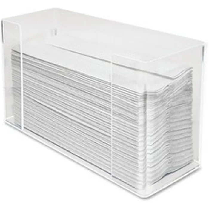 Towel dispenser is designed for use with virtually all C-fold and multifold paper towel brands. Towel dispenser protects towels from moisture and contamination. Acrylic dispenser can be wall-mounted or used on countertop.