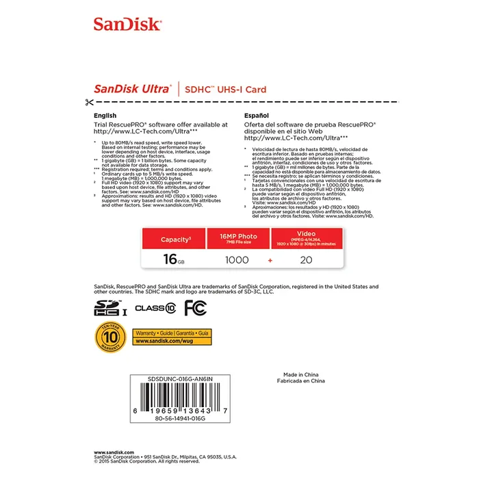Western 1N7674 Sandisk Ultra Sdhc Memory Card 16gb Sdsdunc016gan6in Class 10uhsi 80mbs