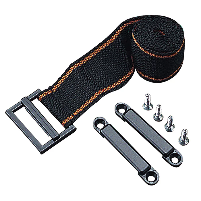 This Heavy-Duty Battery Box Strap & Brackets set includes a durable woven polypropylene strap, designed for longevity, along with an injection-molded nylon buckle. The package features two robust brackets and four #8 FH fasteners, ensuring secure installation for your battery box.