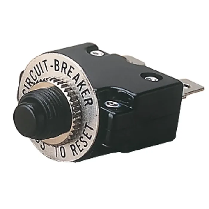Thermal AC/DC Circuit Breakers are designed to protect an electrical circuit from damage caused by excess current. Vibration and shock resistant these push-to-reset circuit breakers are an economical alternative to magnetic breakers. Unlike sacrificial fuses they have the advantage of being resettable after tripping. Panel mounted compact design. Constructed of molded Bakelite with quick connect, terminal style, stamped brass contacts. Optional Thermal Breaker Boot (420839) provides additional protection in wet environments. 5-30A @ 125-250VAC. 32VDC.