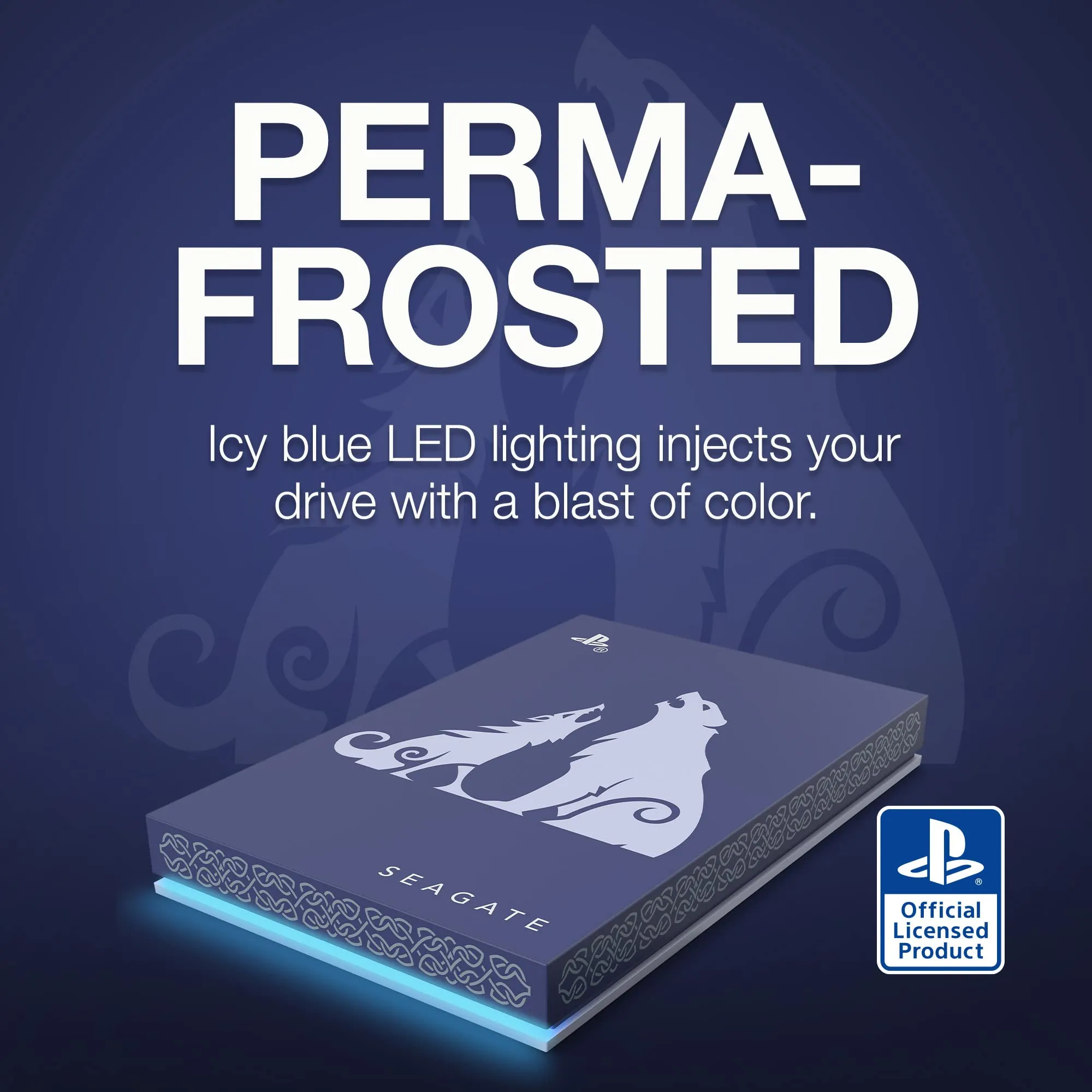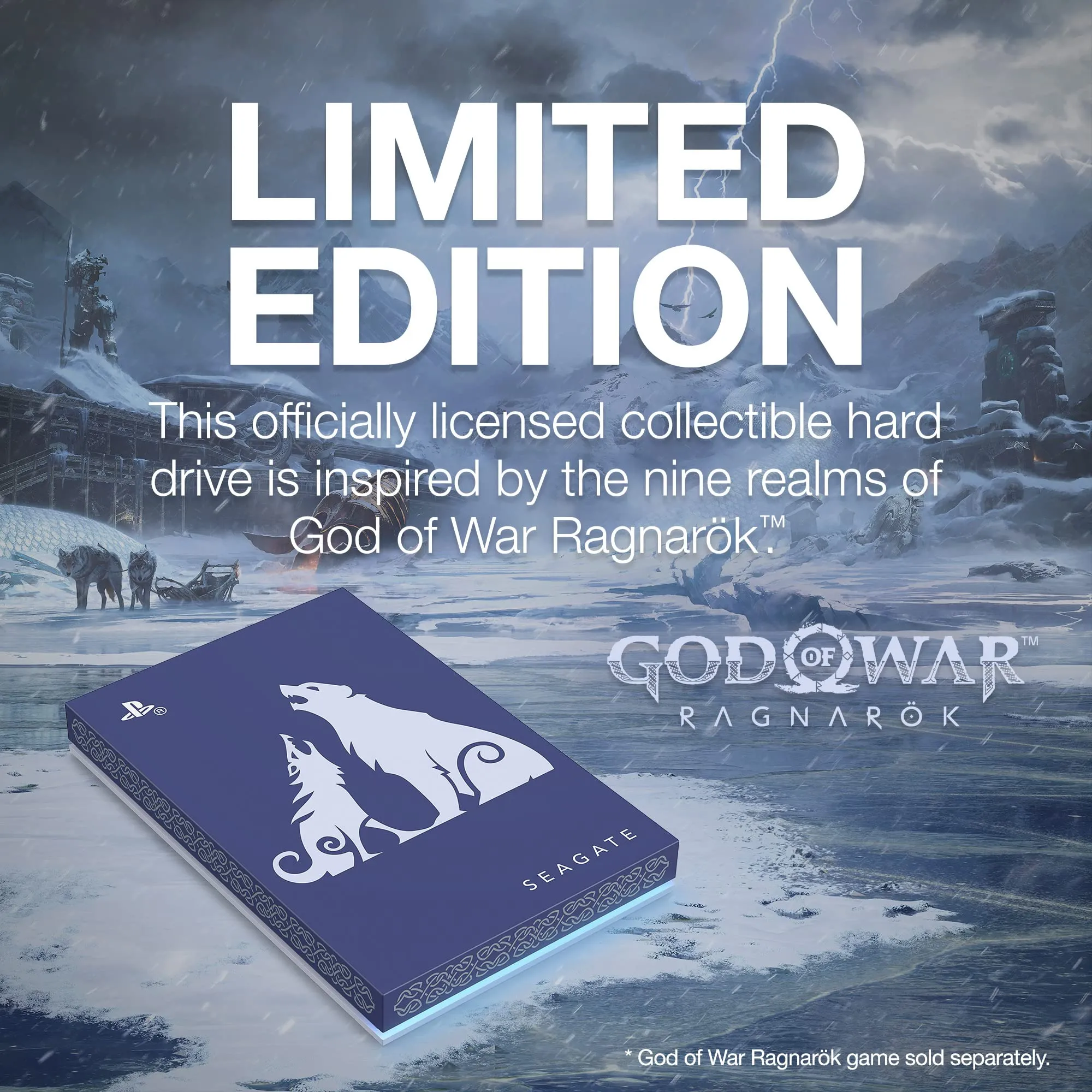 Enhance your gaming experience with the limited edition Seagate Game Drive for PS4, themed around the epic God of War Ragnarök. This external hard drive features a stunning design that brings the world of Norse mythology directly to your console.