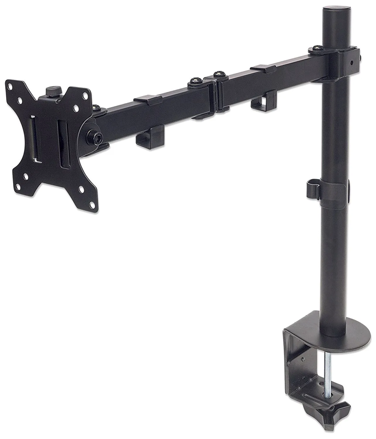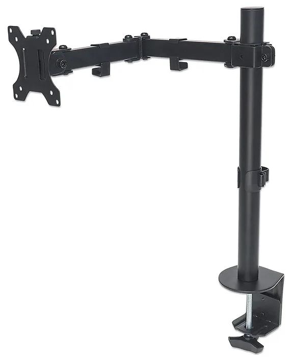 Manage the desktop. Maximize productivity. LCD-monitor installation above the desk helps maximize the effectiveness of a potential workspace. The Manhattan Universal Monitor Mount with Double-Link Swing Arm improves organization on the desktop, making it easier to get work done on the computer. Constructed from durable steel, this single monitor mount features a sturdy clamp that allows for quick, easy and secure mounting without the need to drill holes into desks or countertops. Effectively accompanying a larger display or computer screen, its fully adjustable tilt, rotate, side-to-side, height and tension settings create the perfect position to comfortably increase productivity. Such adjustment capabilities can even help reduce eye fatigue or neck and back strain. In addition, the mount pole offers easy monitor rotation to allow others to view presentations and multimedia productions from almost any direction.