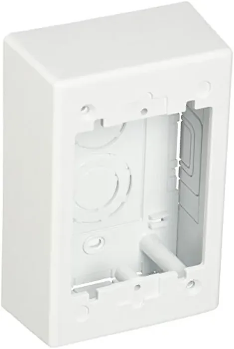 The Panduit Pan-Way Power Rated Surface Mount Outlet Box is designed for safe and efficient surface-mounting of power outlets. This durable white box accommodates a single gang configuration, making it ideal for various installation scenarios.