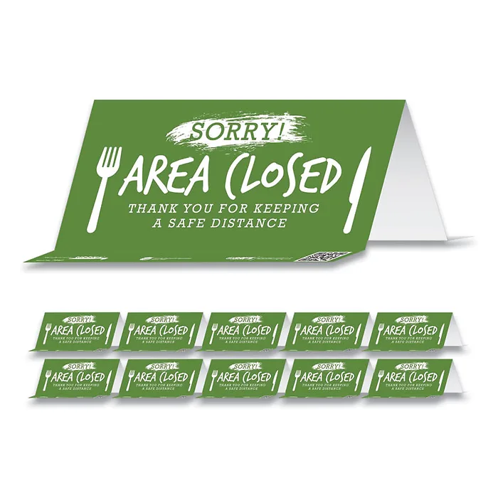 BESAFE MESSAGING TABLE TOP TENT CARD, 8 X 3.87, SORRY! AREA CLOSED THANK YOU FOR KEEPING A SAFE DISTANCE, GREEN, 10/PACK