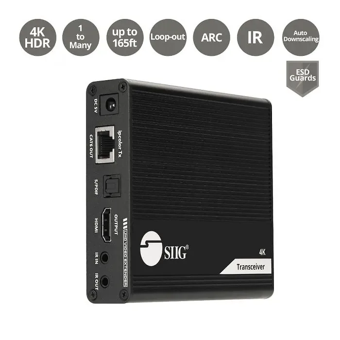 The 4K HDMI 2.0 Daisy Chain Extender Transceiver by SIIG is designed to extend HDMI signals up to 4K resolution. This device allows you to daisy chain multiple extenders for a scalable, high-quality video distribution solution. Ideal for home theater systems, conference rooms, or any setup requiring the transmission of high-resolution content over long distances.