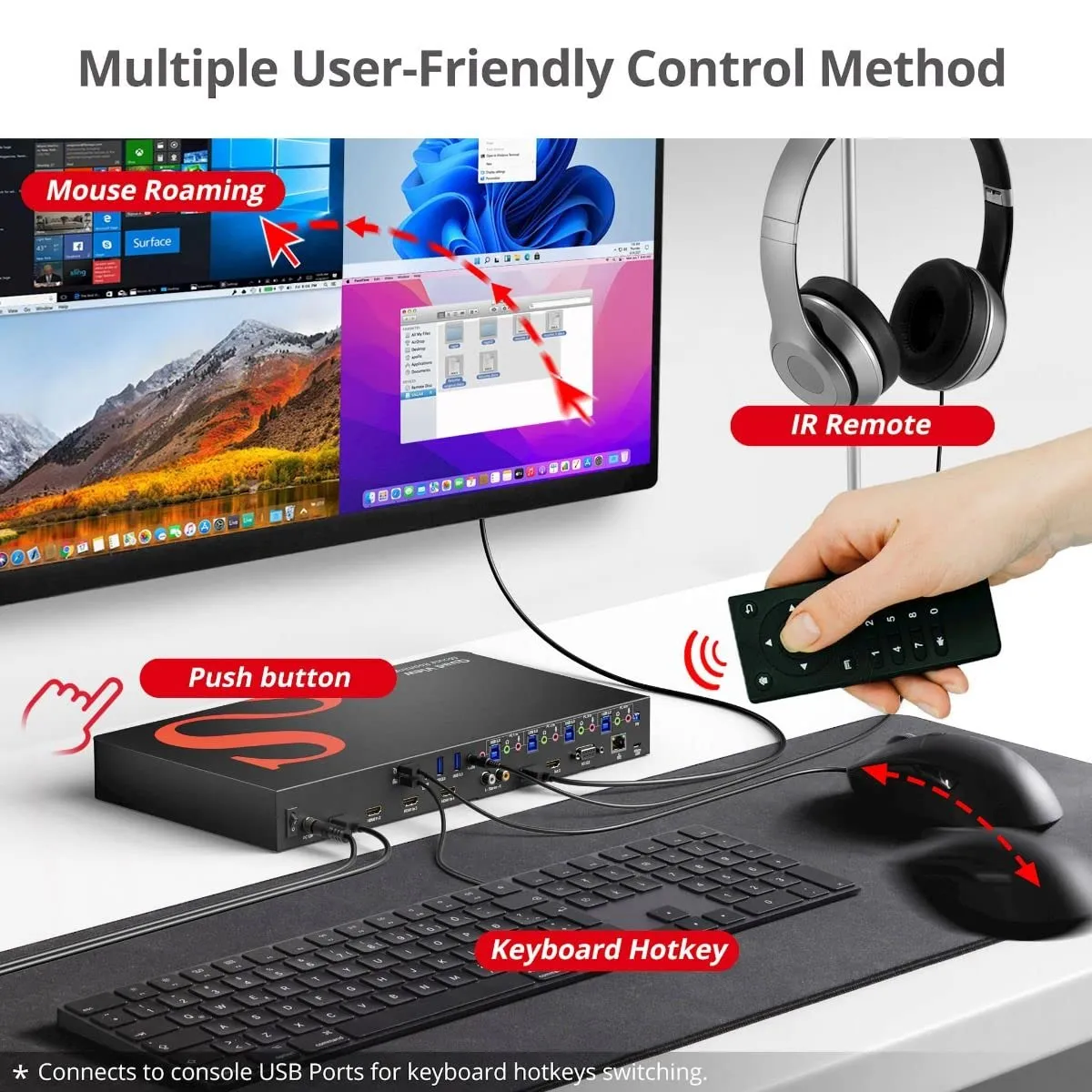 Allows you to control 4 HDMI computers using one keyboard and mouse, 2 HDMI 4K@60, 2 USB-A 3.2 Gen 1 ports, 2 USB 1.1 ports, Microphone input, Stereo audio output, RS-232, RCA L/R stereo audio, DIP switch, Switch button, Hotkeys, IR remote control, Mouse roaming, Full screen, Quad view, and TAA compliant