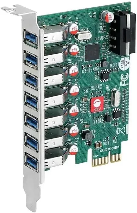 Multiple Connectivity Ports Comes with seven USB 3.0 Type-A ports and one molex port for power input. Manufacturer: SIIG, Inc. Manufacturer Part Number: JU-P70211-S1. Brand Name: SIIG. Product Name: USB 3.0 7-Port PCIe Host Card. Packaged Quantity: 1. Product Type: USB Adapter. [Technical Information] Host Interface: PCI Express 2.0. [Media & Performance] UASP Support: Yes. [Interfaces/Ports] Total Number of USB Ports: 7. Number of USB 3.0 Ports: 7. [Physical Characteristics] Product Color: Black. Form Factor: Plug-in Card. Height: 0.8". Width: 4.7". Depth: 3.3". Weight (Approximate): 2.40 oz. [Miscellaneous] Package Contents: 1 x USB 3.0 7-Port PCIe Host Card 1 x Molex power cable 1 x User reference guide . Platform Supported: PC. Environmentally Friendly: Yes. Environmental Certification: RoHS. WEEE. Country of Origin: China. [Warranty] Limited Warranty: 2 Year.
