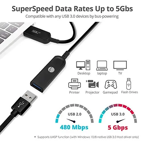 - Active USB 3.0 cable supports data transfer speeds up to 5 Gbps