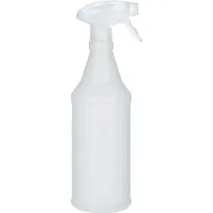 Empty, plastic spray bottle features a trigger-type atomizer cap and flexible plastic tube that is ideal for dispensing cleaners. Chemical-resistant trigger sprayer is adjustable. Bottle is marked with ounce gradations. Bottle is made of 100 percent recyclable plastic with 50 percent post-consumer recycled material.