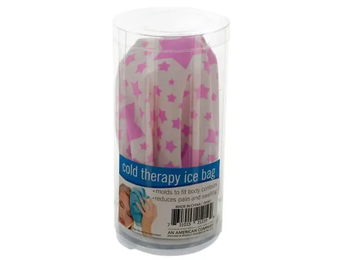 Quickly reduce pain and swelling with this convenient, reusable Small Cold Therapy Ice Bag featuring a durable pink star print cloth bag with plastic lining that molds to fit body contours. Simply unscrew the bottom cap, fill with ice and the ice bag is ready to use. Measures approximately 6" x 3". Comes packaged in an individual box.