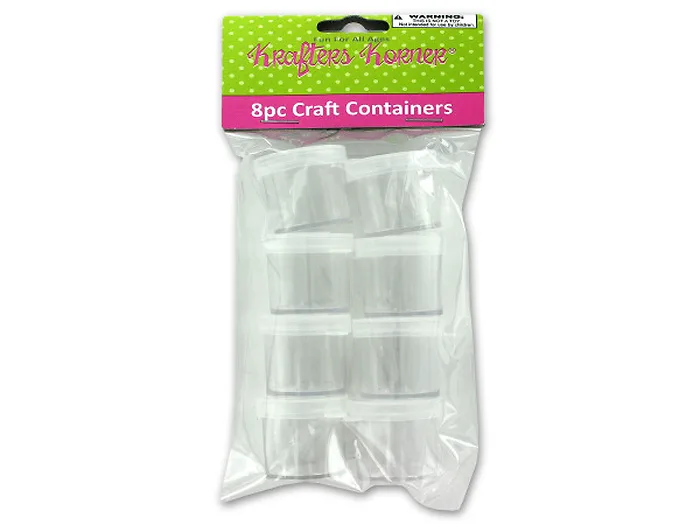 Ideal for a multitude of storage uses as well as uses in craft projects, this 8-piece Small Craft Containers Set features hard plastic containers with flexible plastic tops. Each piece measures approximately 1" x 1". Comes packaged in a poly bag with a header card.