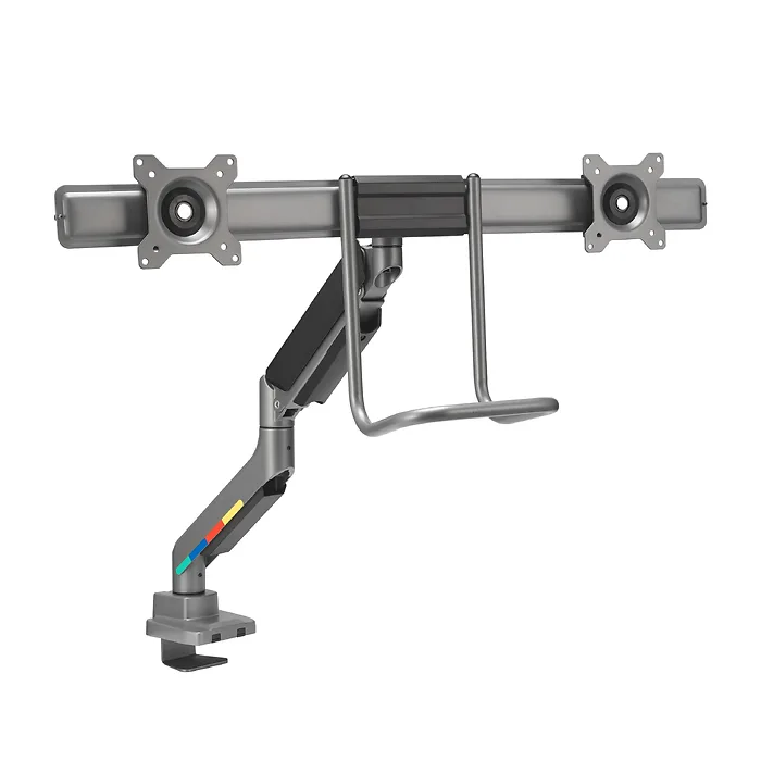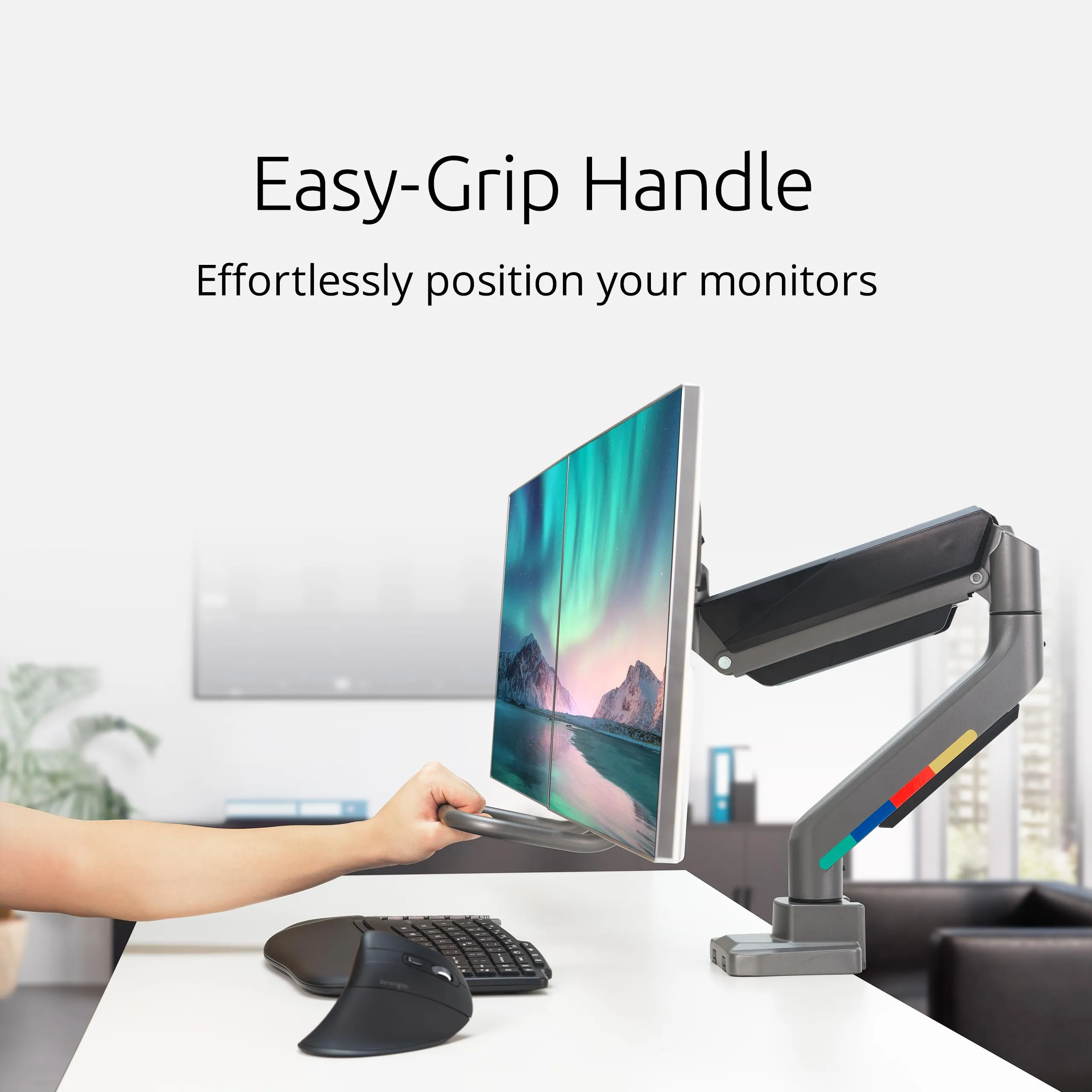 Equipped with a convenient hand grip, users can easily adjust their monitors' height and position with just a light touch. The gas spring mechanism provides counterbalancing force, making even the heaviest dual-monitor configurations feel weightless. Whether it’s elevating displays to alleviate neck strain, tilting for improved visibility, or reorienting for collaborative sessions, the EasyGrip handle facilitates effortless ergonomic customization.