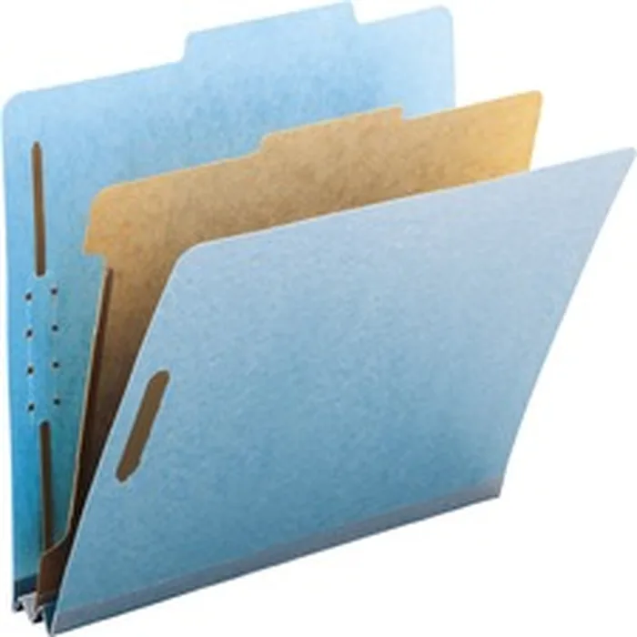 Heavy-duty classification folders with one divider are made with a high percentage of recycled material for the environmentally conscious office and make excellent project files. Heavy-duty classification folders are ideal for personnel, real estate, accounting or banking files. Sturdy, 25 point pressboard has tear-resistant tape in a matching color. Tear-resistant gusset expands to hold 2" of letter-size material. 20 point, kraft stock divider is fully taped to gusset. Classification folders also offer 2/5-cut right of center tabs, 2" prong-style fasteners in positions 1 and 3 and 1" twin-prong fasteners on both sides of the divider.