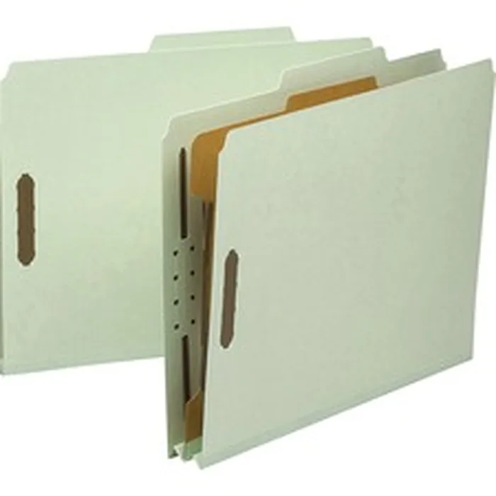 Heavy-duty classification folders with one divider are made with a high percentage of recycled material for the environmentally conscious office and make excellent project files. Heavy-duty classification folders are ideal for personnel, real estate, accounting or banking files. Sturdy, 25 point pressboard has tear-resistant tape in a matching color. Tear-resistant gusset expands to hold 2" of letter-size material. 20 point, kraft stock divider is fully taped to gusset. Classification folders also offer 2/5-cut right of center tabs, 2" prong-style fasteners in positions 1 and 3 and 1" twin-prong fasteners on both sides of the divider.