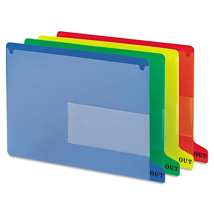 Clearly mark where folders have been removed from your shelf filing system with these end-tab out guides. Small translucent pocket holds charge-out form indicating file taken, date taken and by whom, while the larger pocket temporarily holds full-size documents to be filed in the folder when it is returned. Tabs in 1/5-cut bottom position are embossed with the word, "OUT." Letter-size out guides are made of 20 point poly material that is acid-free and archival quality.