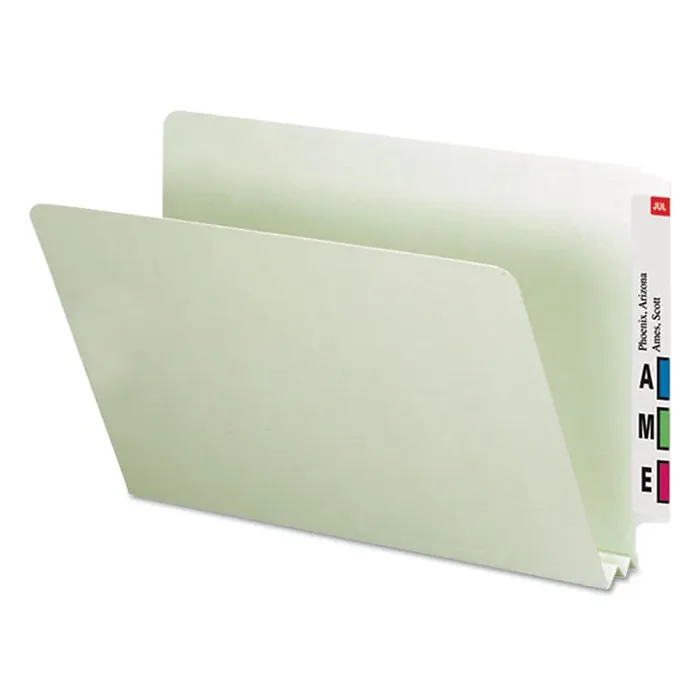 End-tab pressboard pocket folders hold large, bulky files. These heavy-duty, legal-size folders are ideal for factory or outdoor work-site environments. Sturdy, tear-resistant gusset expands to hold up to 2" of paperwork. Straight-cut tabs are 3/4" wide.