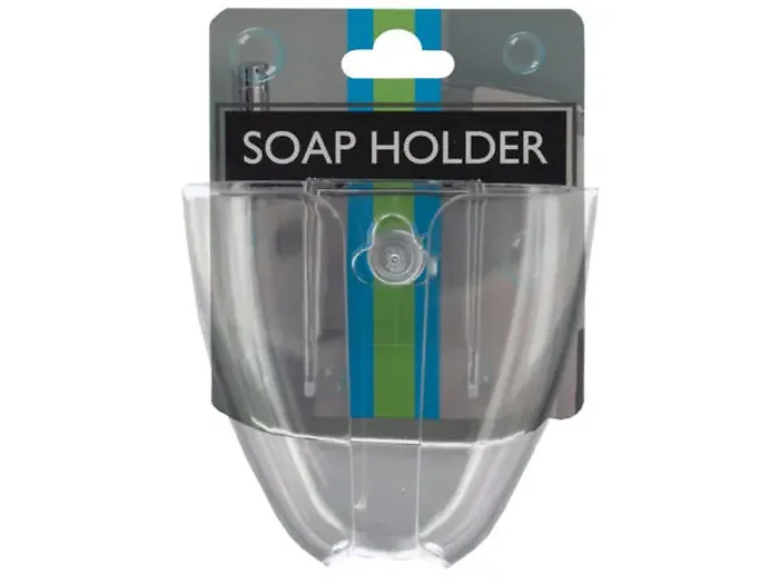 Keep your bar soap in easy reach with this convenient Soap Holder featuring a transparent plastic holder with an open section in front and bottom for drainage and a strong suction cup on the back for easy mounting. Holder is easy to clean and made of durable plastic. Measures approximately 3.5" x 2" x 3.375". Comes packaged with a hanging panel.