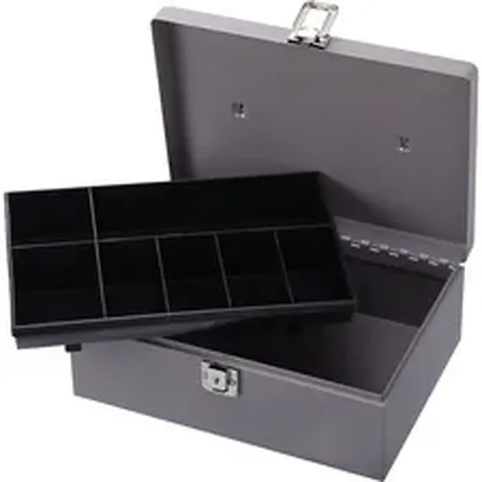 Cash box features a latchkey lock and seven-compartment tray to safeguard your money and other valuables. Removable seven-compartment tray allows storage underneath. Tray has one long compartment for cash and six smaller compartments for coins and other items. Steel construction includes heavy-duty steel hinges. Cash box includes two keys.