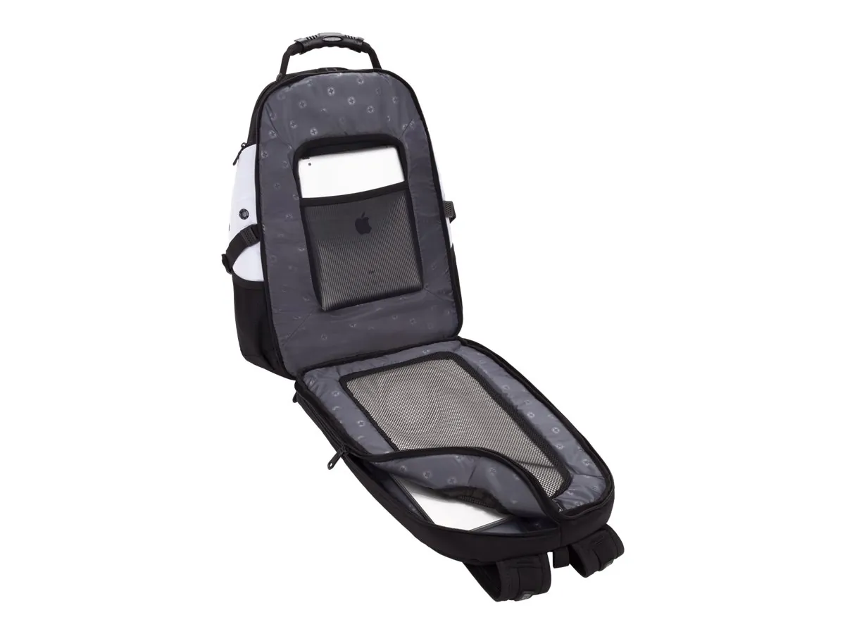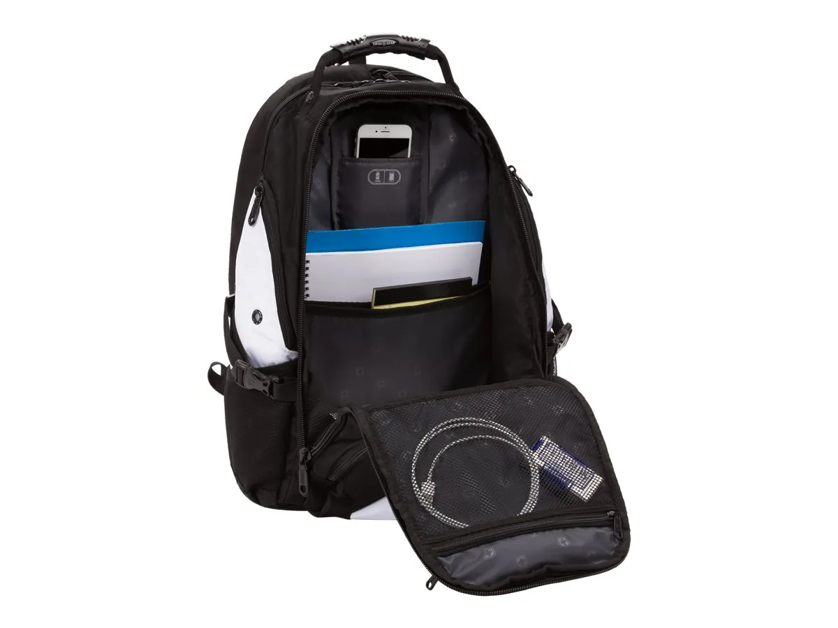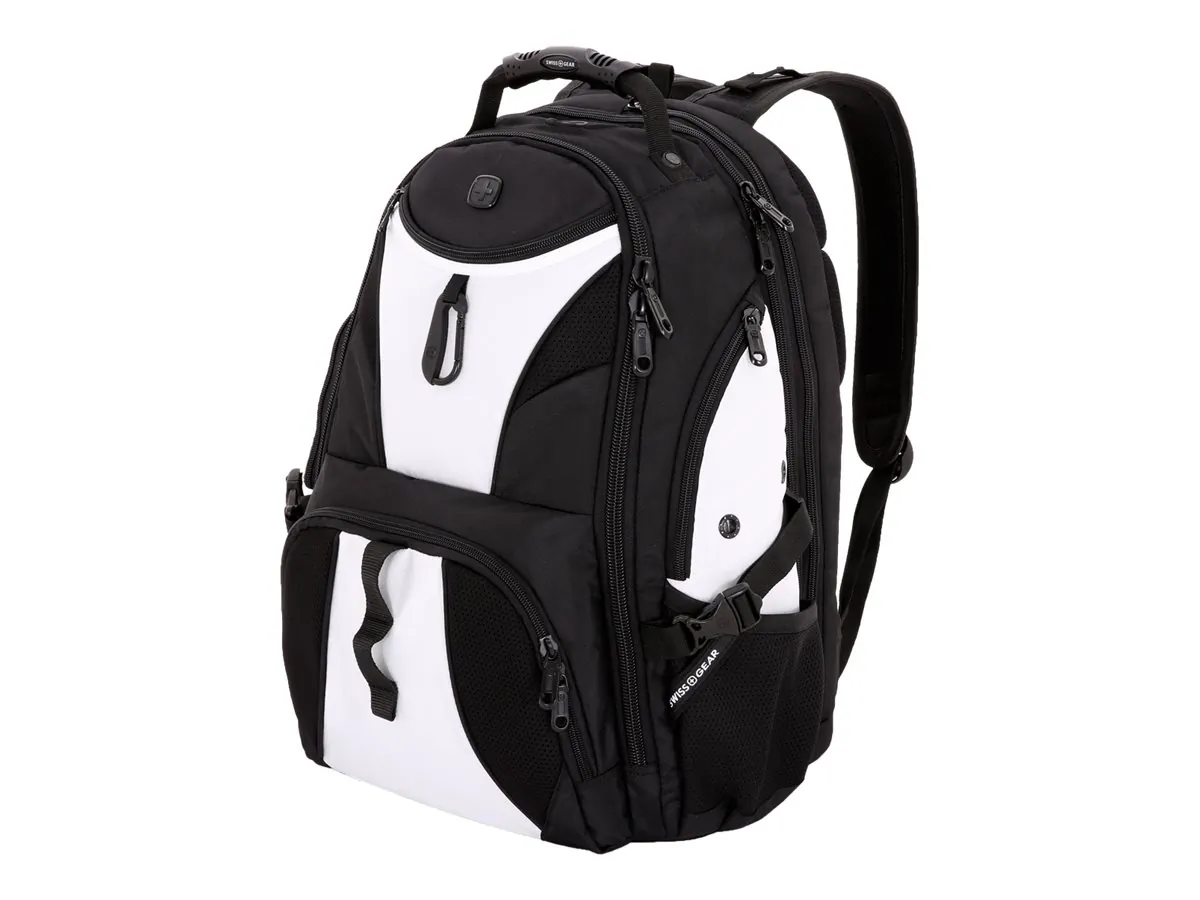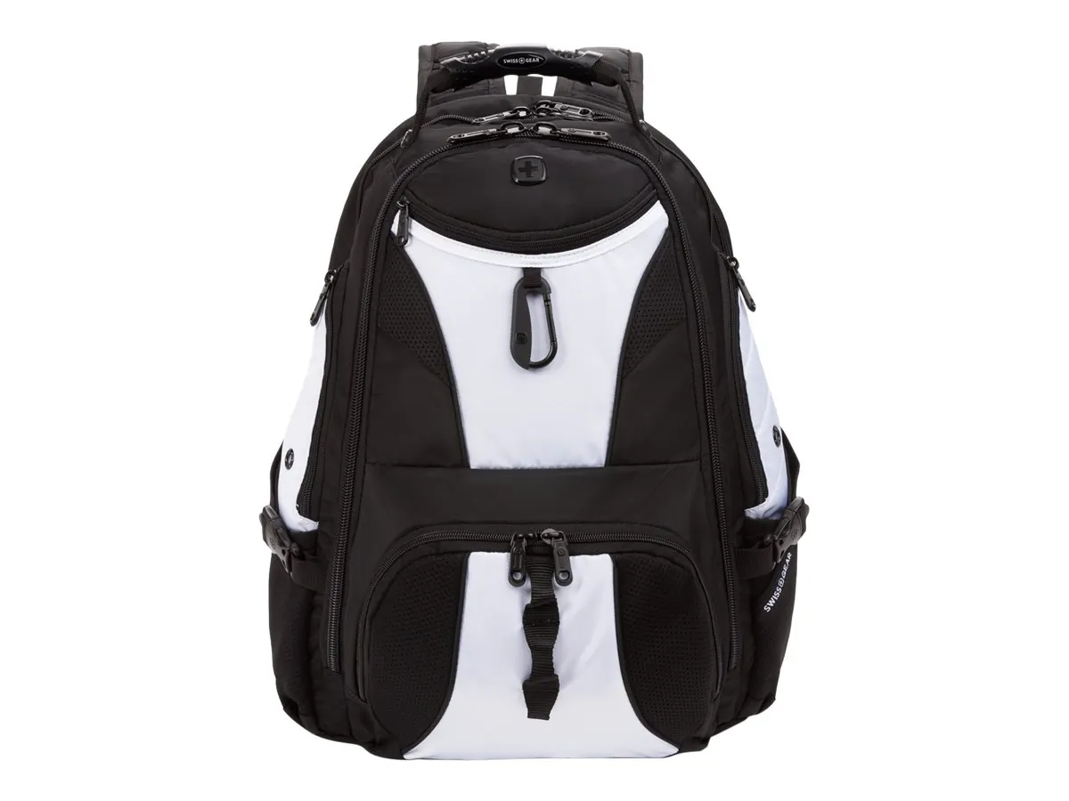 The SWISSGEAR 1900 Scansmart Laptop Backpack is designed for those on the go. Featuring a sleek black and white design, this backpack comfortably stores laptops up to 17 inches while providing easy access through TSA-friendly compartments.
