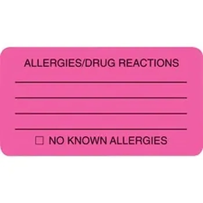ALLERGY WARNING LABELS, ALLERGIES/DRUG REACTIONS NO KNOWN ALLERGIES, 1.75 X 3.25, PINK, 250/ROLL