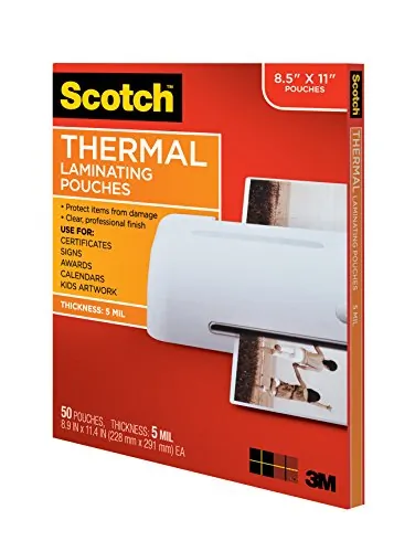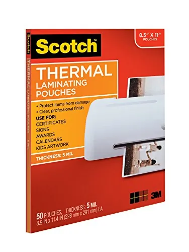 Laminating pouches are designed for use with the 3M Scotch Thermal Laminator or any standard thermal-pouch laminator. Pouches provide instant, two-sided protection for frequently handled or referred to items. Photo-safe pouches are clear to let important information show through with a professional finish. Preserve and protect documents, awards, signs, calendars, certificates, children's artwork, schedules and more.
