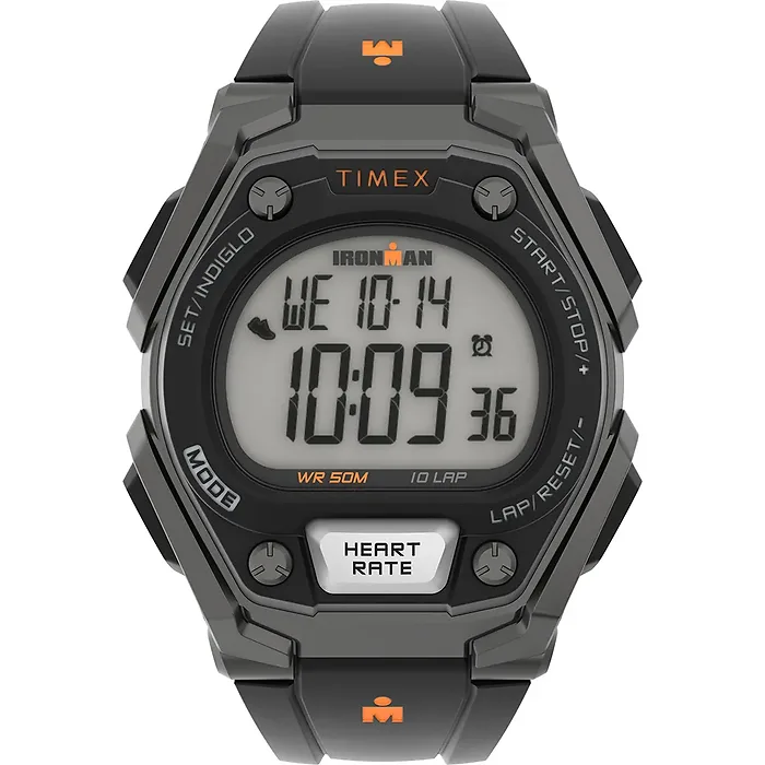 Timex IRONMAN® HRM + Activity Tracker is a watch born of necessity. Inspired by a renewed appreciation for our health, wellness, and the great outdoors, this sporty 43mm timepiece is designed to help empower a better, healthier you. Featuring an easy-touch heart rate and daily activity monitor, the IRONMAN HRM + Activity Tracker is battery operated—no app, no charging, just function—and comes complete with a battery hatch on the case back for an easy swap when necessary. We’ve packed in all the practical features you’ve come to expect from the Timex IRONMAN including 50 meters of water resistance; INDIGLO® backlight; chronograph, alarm, and timer; and an impressively comfortable black resin strap.