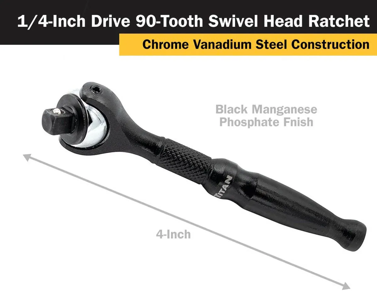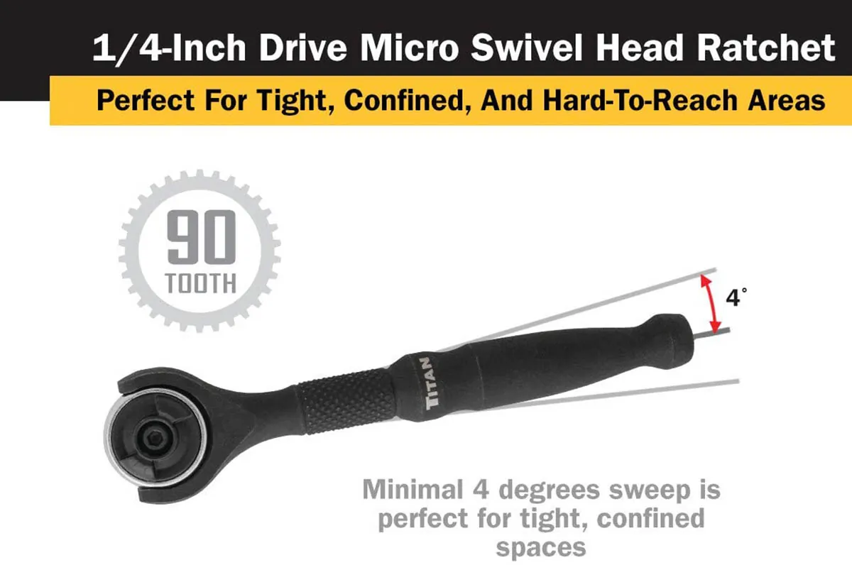 The Titan 1/4" Drive Swivel Head Micro Ratchet is designed for precision and versatility in tight spaces. Its compact design allows for easy maneuverability, making it an essential tool for mechanics and DIY enthusiasts alike.