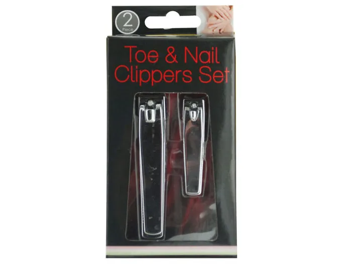 Perfect for keeping all of your nails healthy and trimmed, this Toe & Nail Clippers Set features 2" metal fingernail clippers and 3" metal toenail clippers. Metal handles provide leverage for easy clipping. Sharp blades leave clean cuts without jagged edges. Comes packaged in a hanging box. Box measures approximately 2.75" x 0.75" x 5.625".
