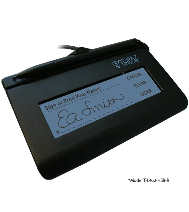 The Topaz T-L462-B-R Signature Gem LCD 1x5 Electronic Signature Pad is an ideal solution for various organizations, as it is a highly secure device to capture electronic signatures.