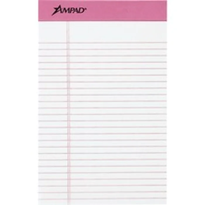 Perforated pad with distinctive pink binding and ruling features heavyweight, 60 point, chipboard backing. Sheets are microperforated for clean, easy removal. Each writing pad contains 50 ruled sheets of high-quality 20 lb. white paper. Each 5" x 8" sheet has 9/32" line spacings and a 13/16" left margin printed in pink ink.