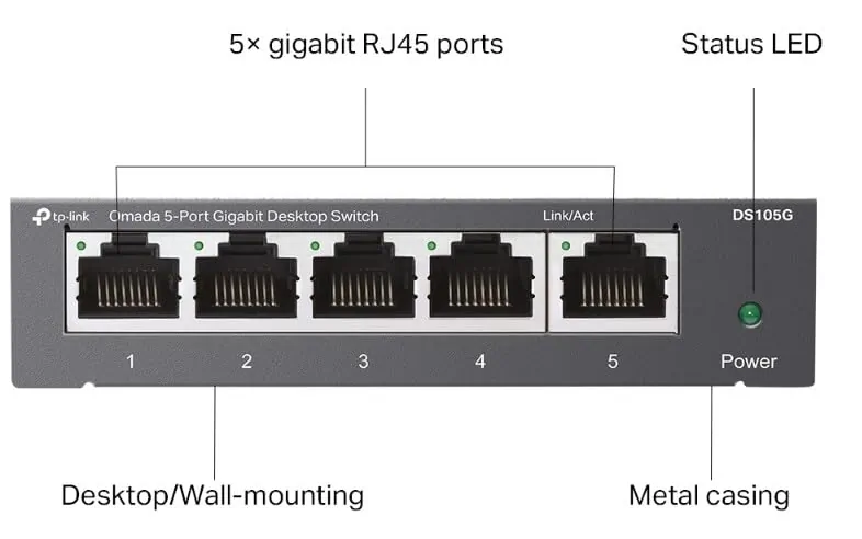 - 5x 10/100/1000 Mbps Auto-Negotiation RJ45 ports supporting Auto-MDI/MDIX