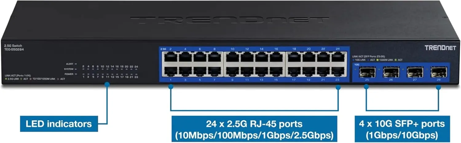 The TRENDNET 28-Port 2.5G Ethernet Switch is designed to provide high-speed network connectivity for demanding applications. Featuring 28 ports, this switch supports 2.5G connections and includes several 10G SFP+ ports for uplink flexibility.