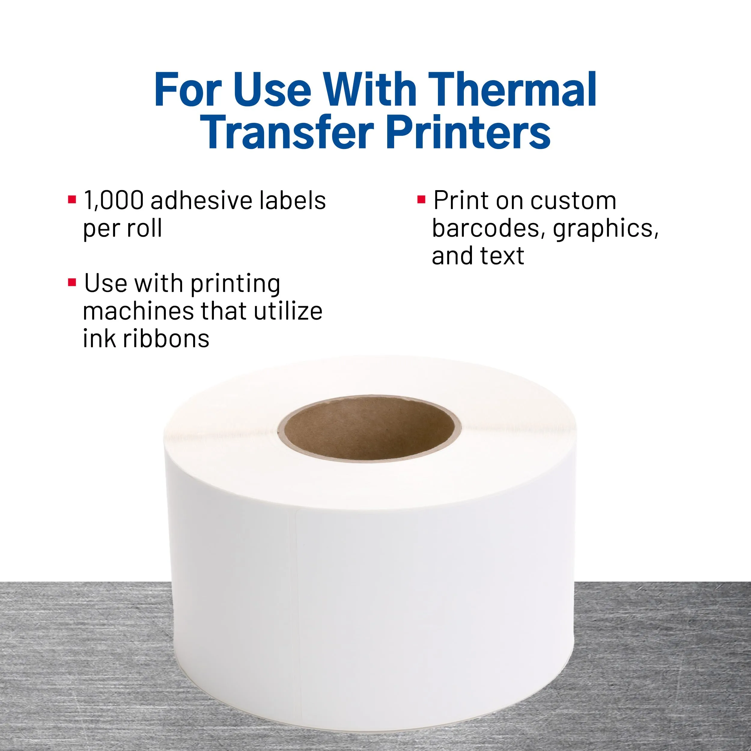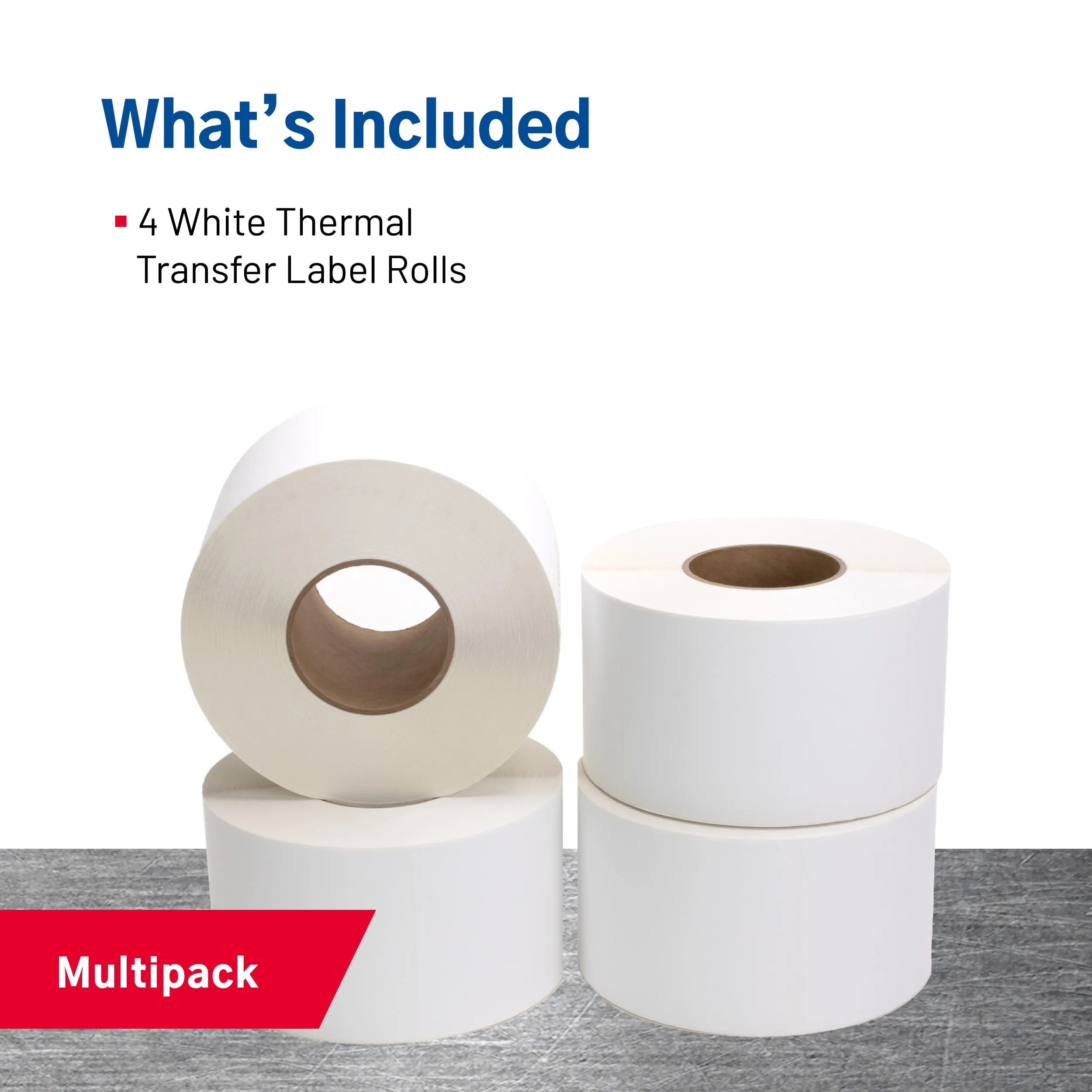 The TSC/PTX Industrial Thermal Transfer Labels are designed for efficiency and quality. Measuring 4 inches by 6 inches with a 3-inch core and an 8-inch outer diameter, these labels ensure smooth printing and easy application. Each roll contains 1000 labels, and this package includes 4 rolls for a total of 4000 labels.