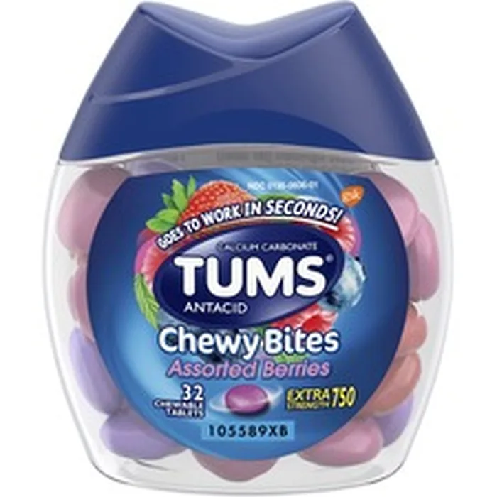 Chewy Bites Chewable Antacid Tablets provide extra-strength power in a crunchy, chewable antacid tablet for a tasty way to get fast relief. When symptoms occur, take two to four chewable antacids, depending on the severity of your acid indigestion. Made with the active ingredient calcium carbonate, these chewy antacids relieve heartburn, sour stomach, acid indigestion and upset stomach. With a delicious outer shell and soft center, these antacids come in three assorted berry flavors. Antacid tablets are gluten-free with an active ingredient that can be found in nature. Resealable bottle is easy to take in a purse or pocket so you're ready when heartburn strikes.