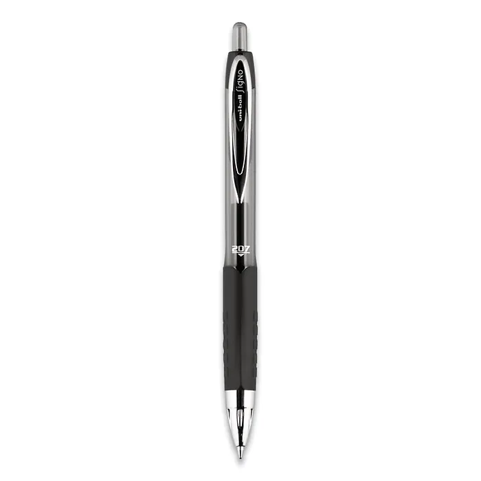 Retractable gel pen contains specially formulated ink that helps prevent a common form of check fraud known as "check washing." Special formulated, uni Super Ink becomes trapped in paper, helping to prevent against water, fading and document fraud. Thick vibrant lines allow you to make a bold statement every time you write. Textured rubber grip offers superior writing and control while the retractable tip provides added convenience. Use the clip-on barrel to attach the pen to notebooks, pockets and more. Uni-ball 207 Retractable Pen is refillable.