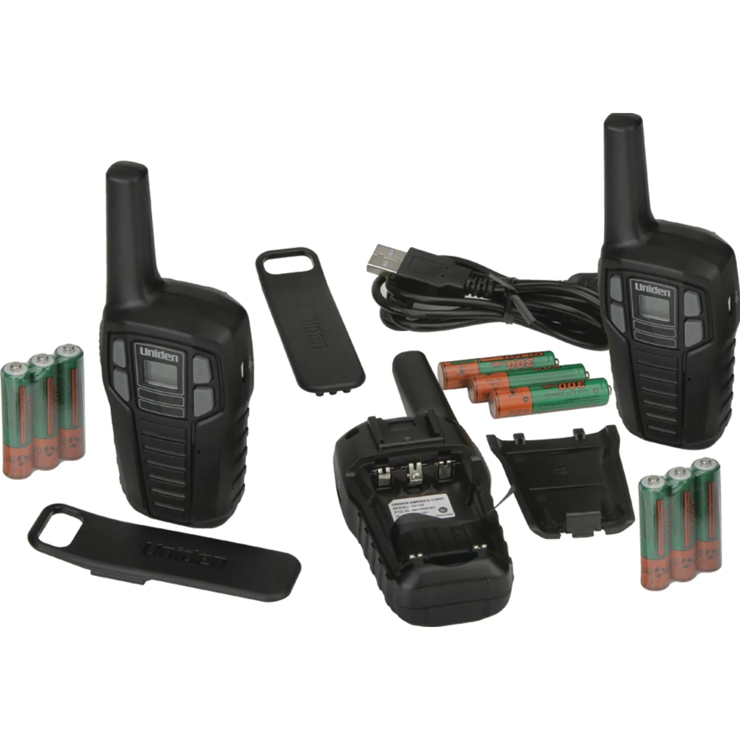 Uniden Sx167-3ch 16-Mile 2-Way FRS/GMRS Radios, 3-Pack with 9 Batteries:22 channelsNOAA weather channelsRoger beepHeadset jackIncludes 9 rechargeable 300mAh NiMH AAA batteries, USB to microUSB Y-cable and carabiner loop belt clipsNatralock packaging3-pack