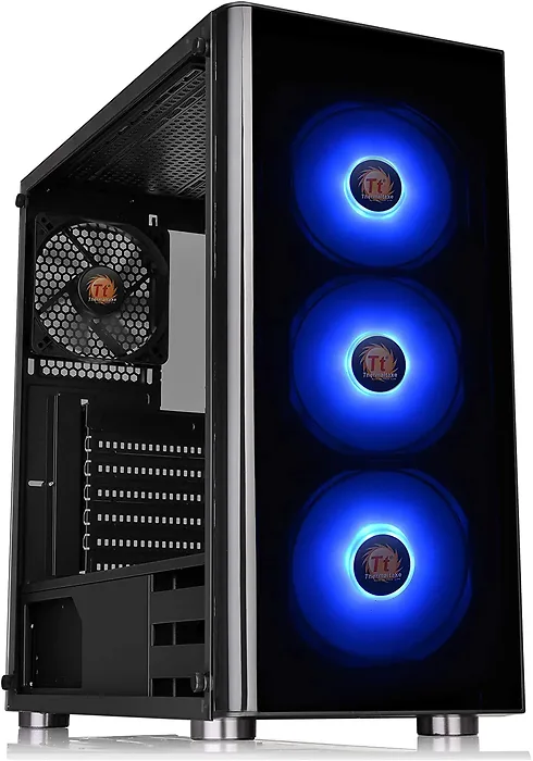 Thermaltake V200 Tempered Glass RGB Edition Mid Tower Chassis. Features a durable tempered glass window, clear acrylic front window, and a PSU cover. Includes 3 120mm 12V RGB intake fans controlled via the I/O port RGB button or synchronized with RGB capable motherboards from Asus, Gigabyte, MSI, Biostar, and ASRock. Designed for high-end hardware and custom system builds.
