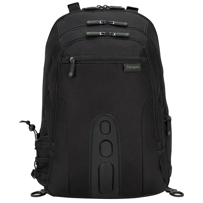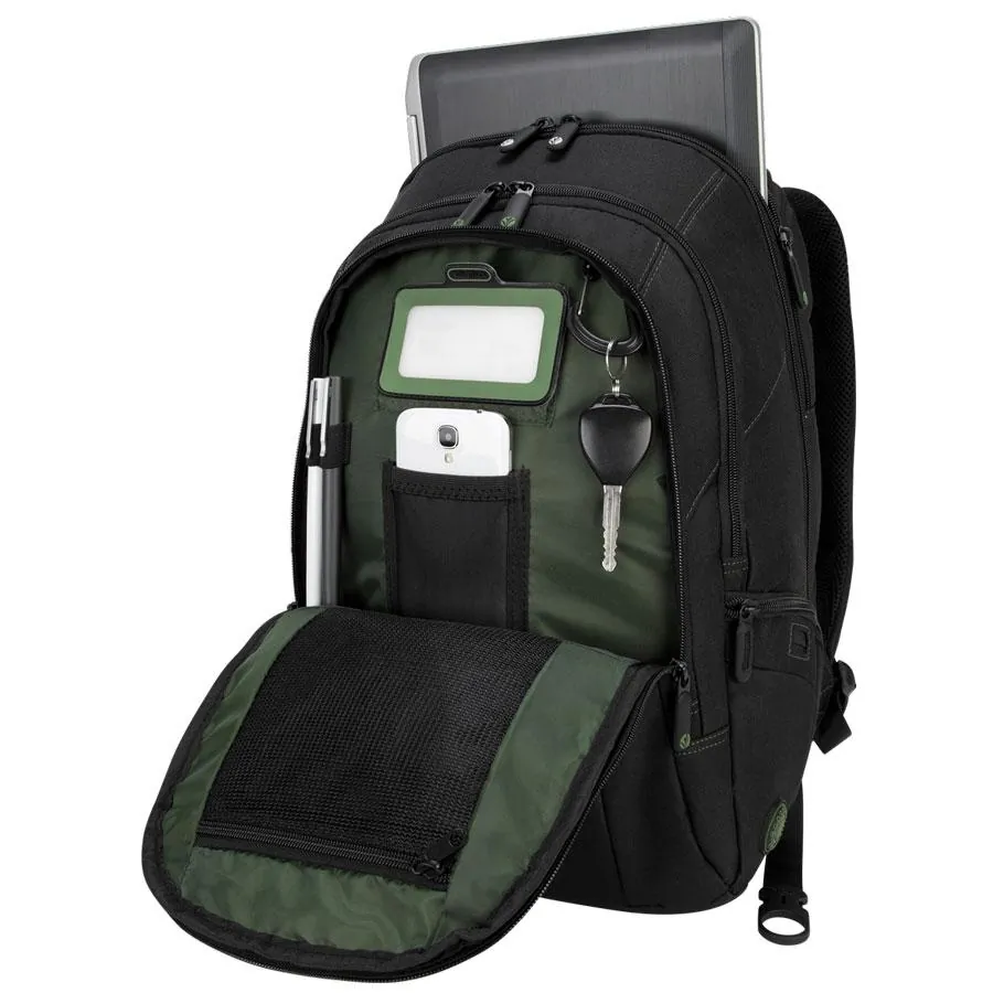 A perfect blend of style and storage, the Spruce? EcoSmart® Checkpoint-Friendly Backpack is designed to protect widescreen laptops up to 15.6" in size. Eco-friendly to its core, it?s constructed with polyester made from recycled plastic bottles and features nickel-free hardware and recyclable plastic components. To store your essentials, the backpack features a key clip, water bottle holder, MP3 player, business card holder, pen loops, and accessory compartments. A quick-access front pocket provides a convenient place to store items while on the go. The padded back panel and adjustable shoulder strap allow for a customized, comfortable fit. A colorful green interior lightens the case, making items stored inside more visible. Both sleek and sporty, the Spruce line offers a durable option with carefully selected materials to minimize your carbon footprint.